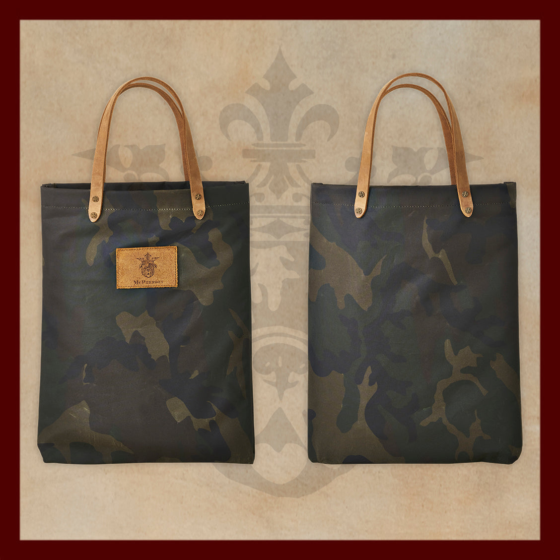 Waxed Cotton Canvas with Distressed Cowhide Straps in Camouflage Pattern