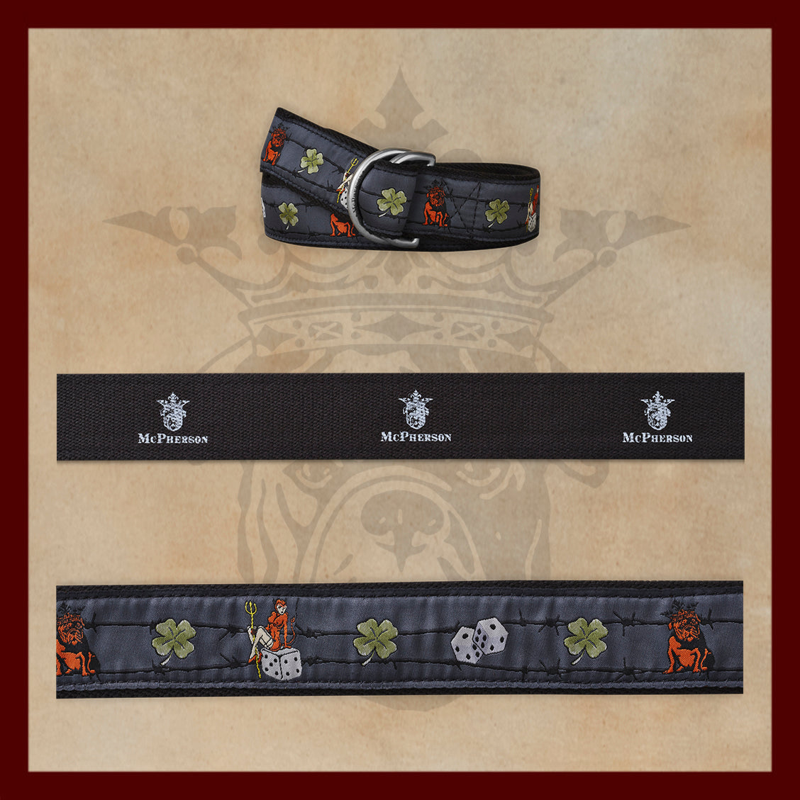 • • Sturdy McPherson de-bossed D ring buckle
