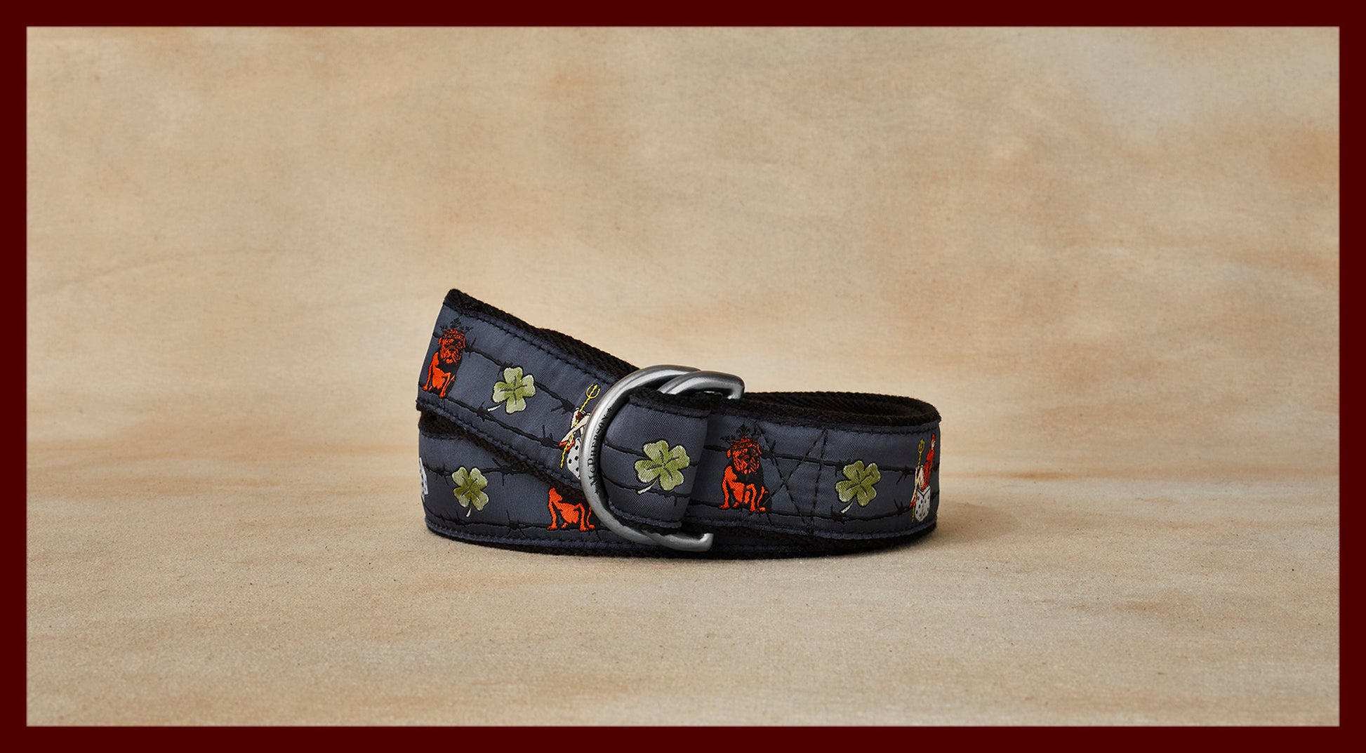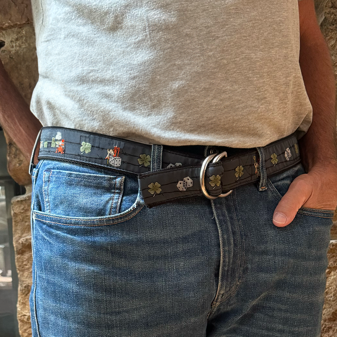 An artist designed exclusive pattern woven by master craftsmen stitched to our custom durable polyester web belt fitted with our solid brass D ring belt buckle. Made by hand in the USA.