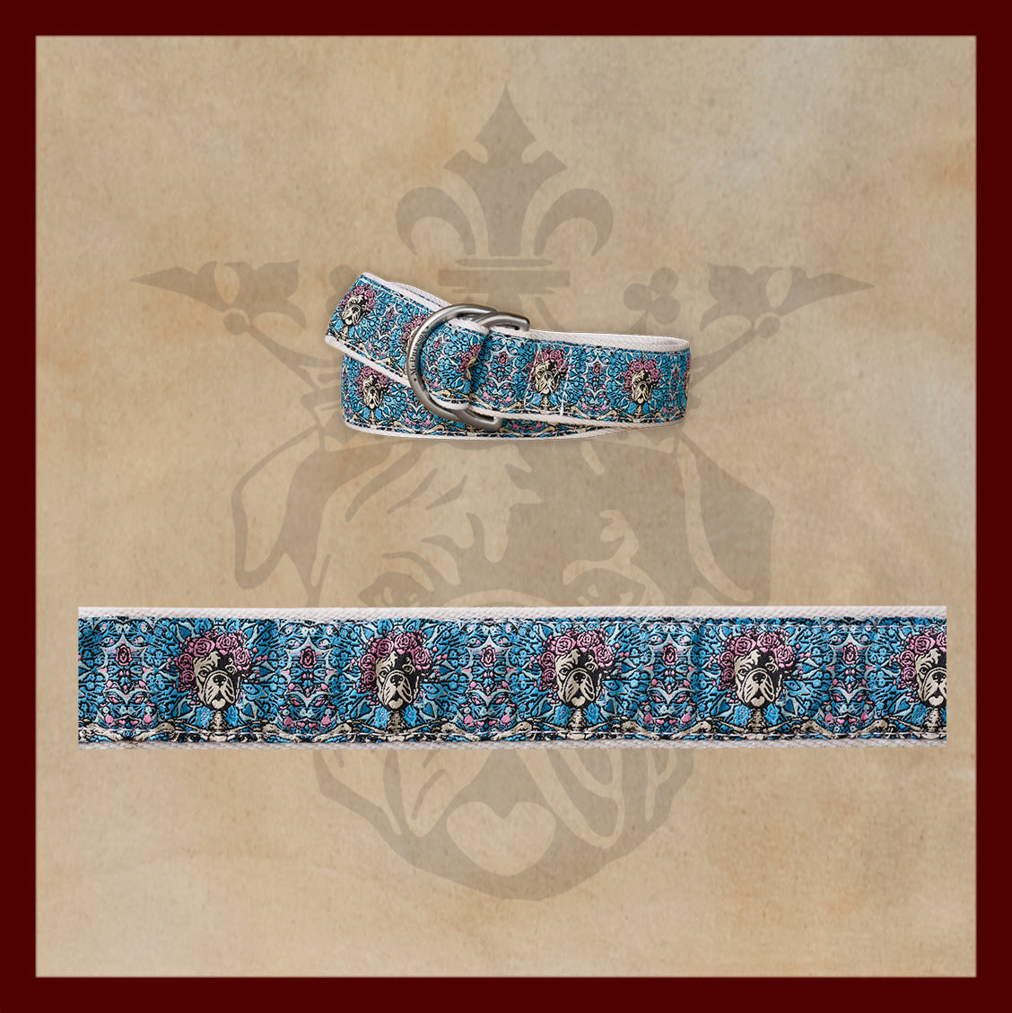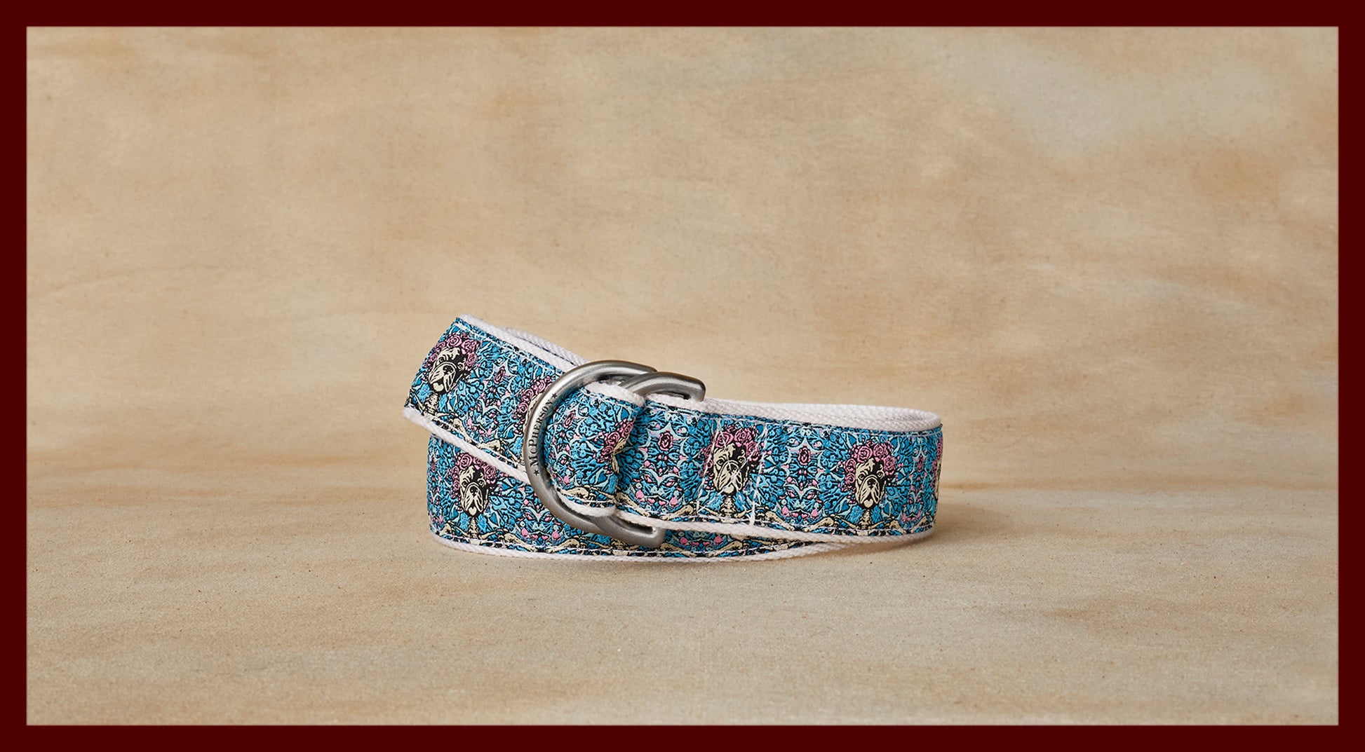An artist designed exclusive pattern woven by master craftsmen stitched to our custom durable polyester web belt fitted with our solid brass D ring belt buckle. Made by hand in the USA.