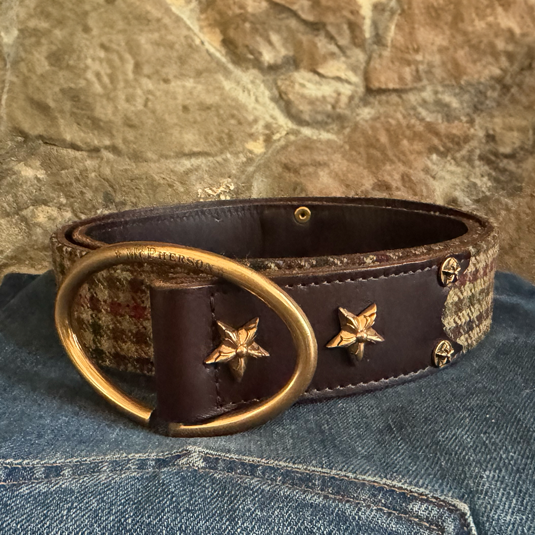 Scottish wool plaid tweed combined with Italian vegetable tanned cowhide fitted with our iconic Rufus Elliptic buckle and Chicago screws. Variations in leather color and texture are natural, ensuring each belt is unique. Made by hand in the USA.
