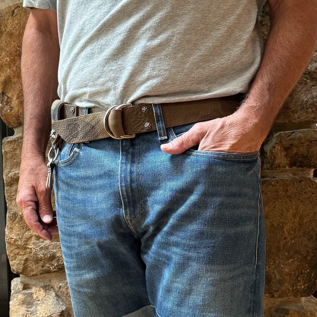 Vegetable tanned top grain cowhide strap sourced at the finest tanneries in Italy and fitted a sturdy brass DD ring buckle closure and sculpted star shaped rivets. Variations in leather color and texture are natural, ensuring each belt is unique. Made by hand in the USA.