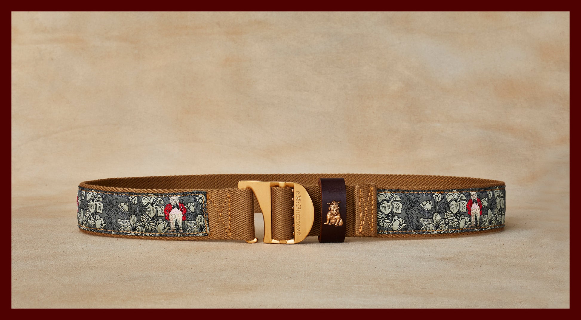 An artist designed exclusive pattern woven by master craftsmen stitched to our custom durable polyester web belt fitted with our solid brass tank buckle. Fit to your liking once and never bother again. Made by hand in the USA