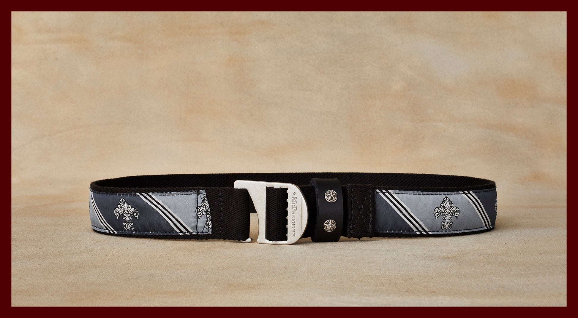 An artist designed exclusive pattern woven by master craftsmen stitched to our custom durable polyester web belt fitted with our solid brass tank buckle. Fit to your liking once and never bother again. Made by hand in the USA.