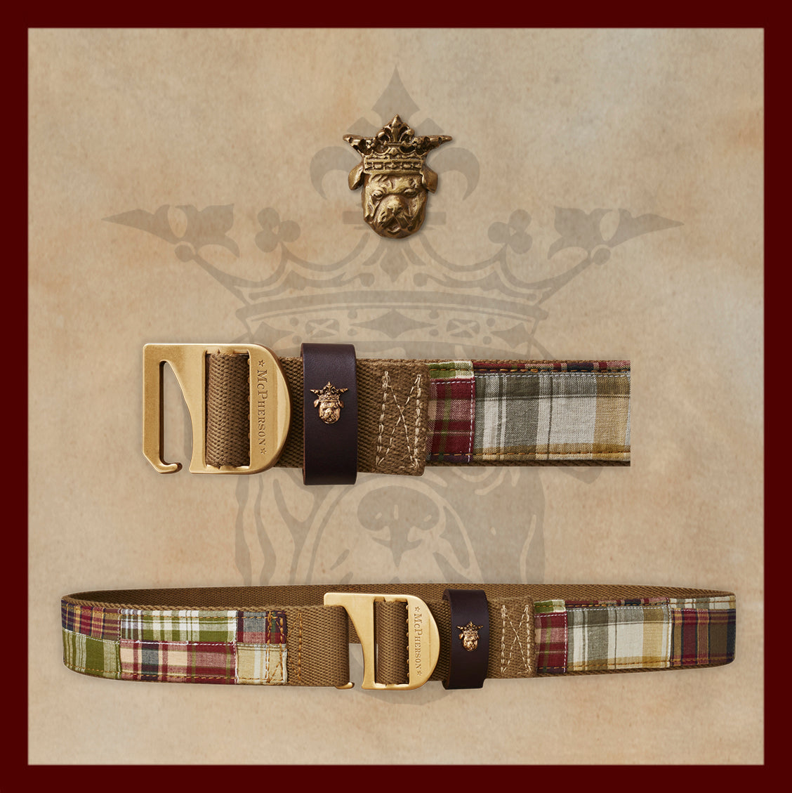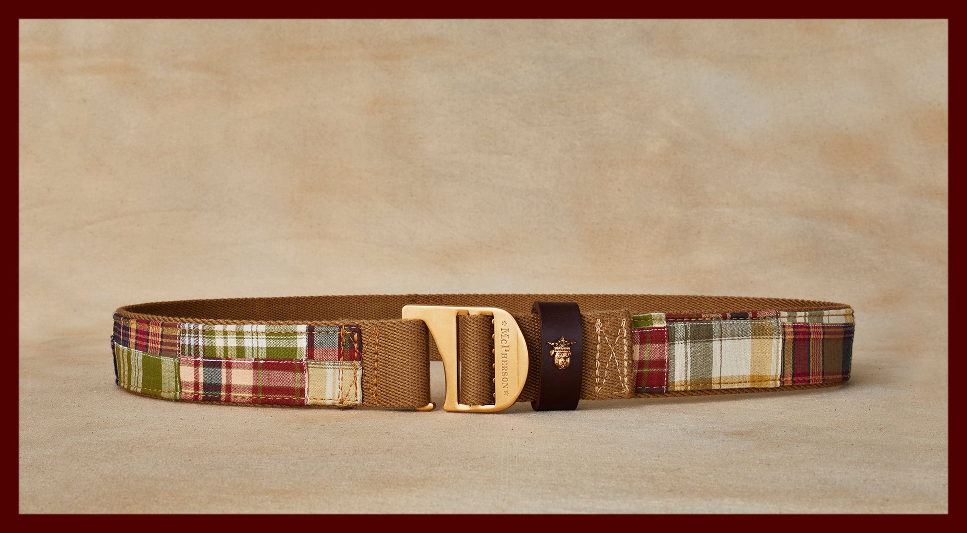 Vintage inspired 100% cotton madras plaid patchwork cloth stitched to our custom developed durable polyester web belt fitted with our solid brass tank. Fit to your liking once and never bother again. Made by hand in the USA.