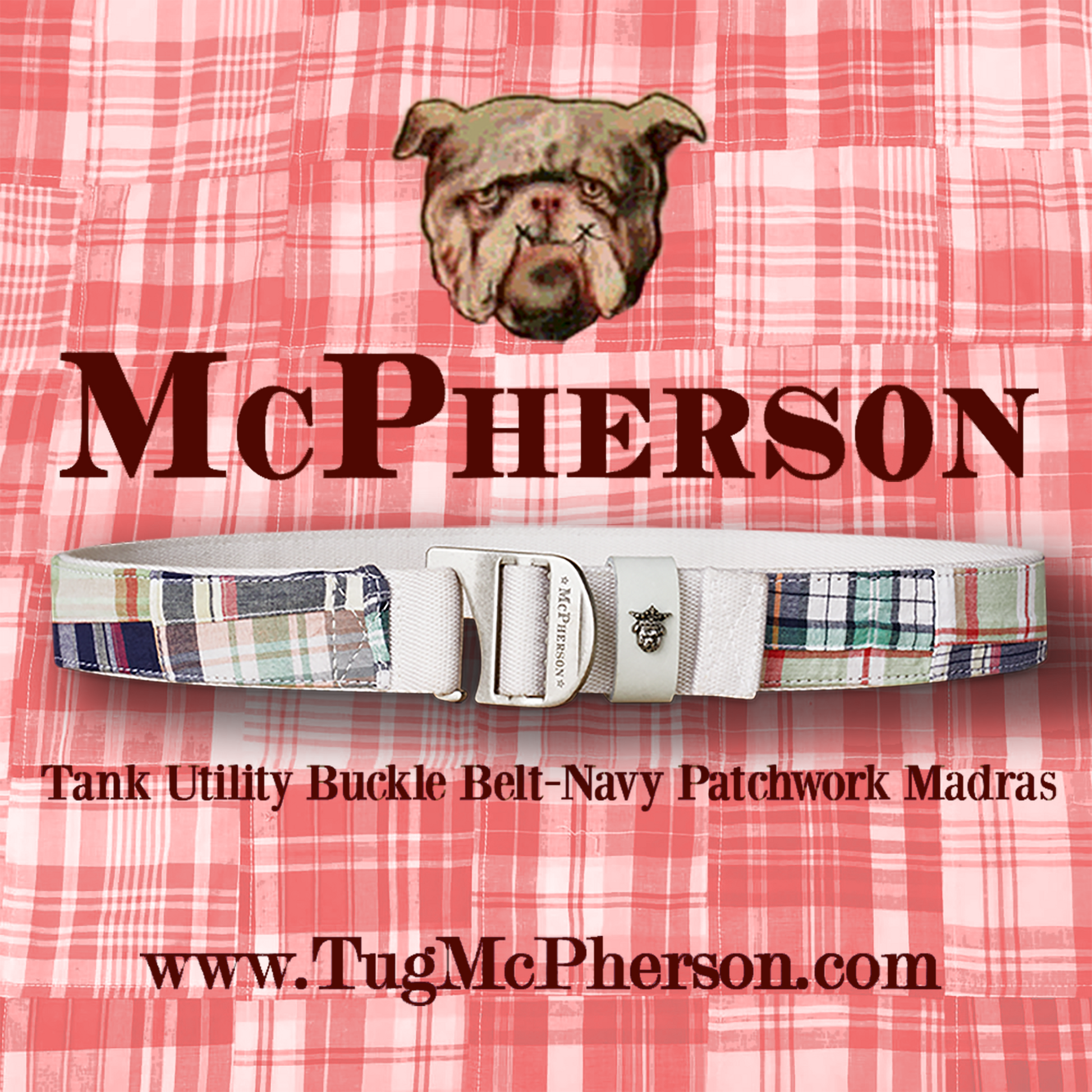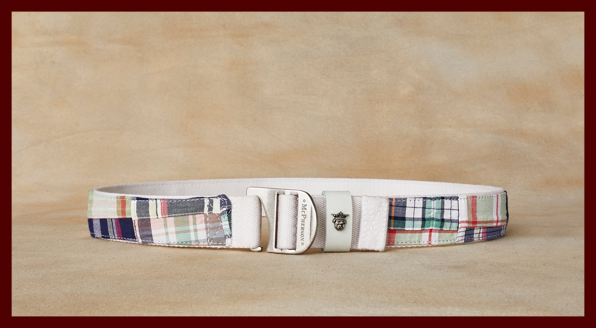 Vintage inspired 100% cotton madras plaid patchwork cloth stitched to our custom developed durable polyester web belt fitted with our solid brass tank. Fit to your liking once and never bother again. Made by hand in the USA.
