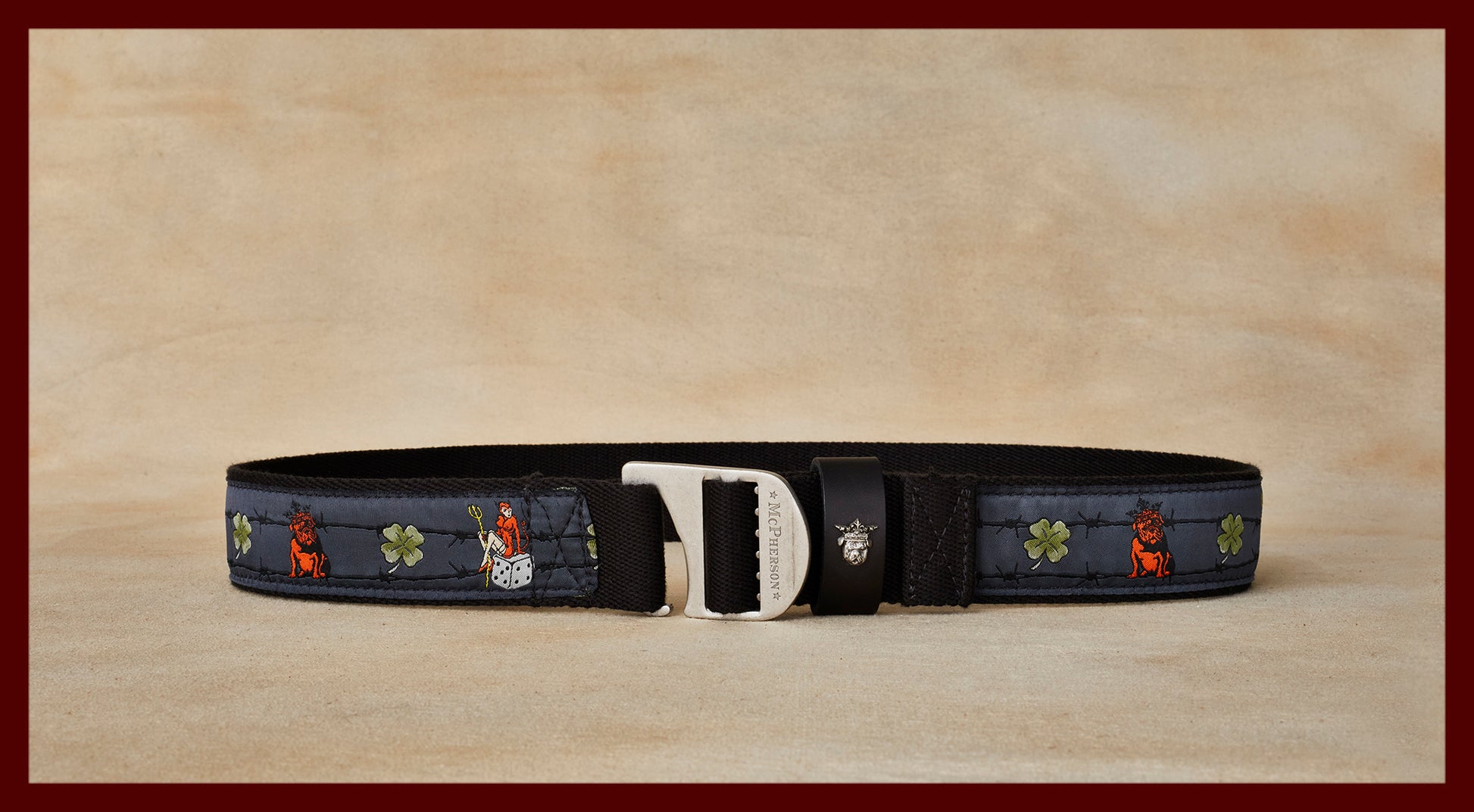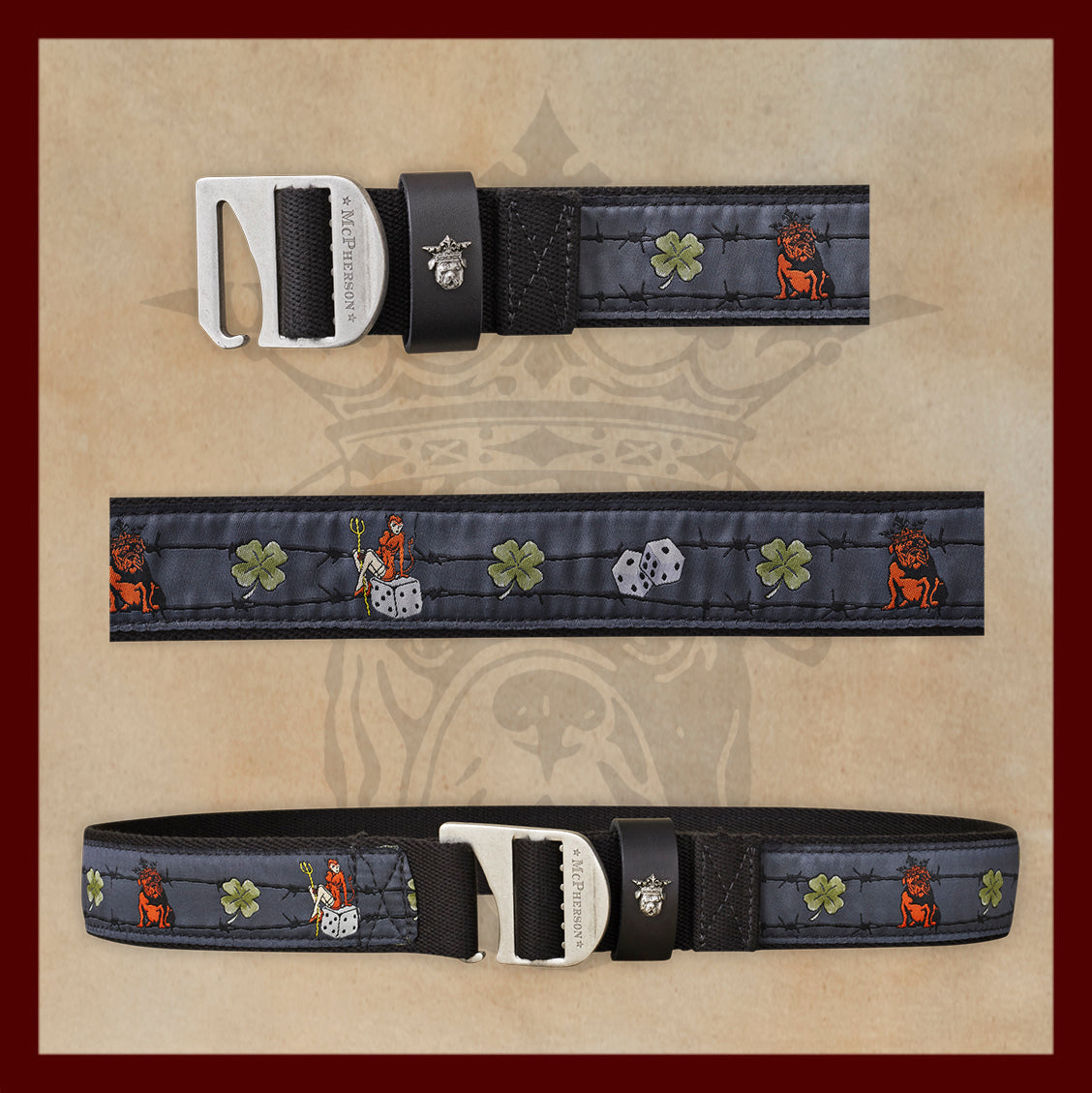 An artist designed exclusive pattern woven by master craftsmen stitched to our custom durable polyester web belt fitted with our solid brass tank buckle. Fit to your liking once and never bother again. Made by hand in the USA.