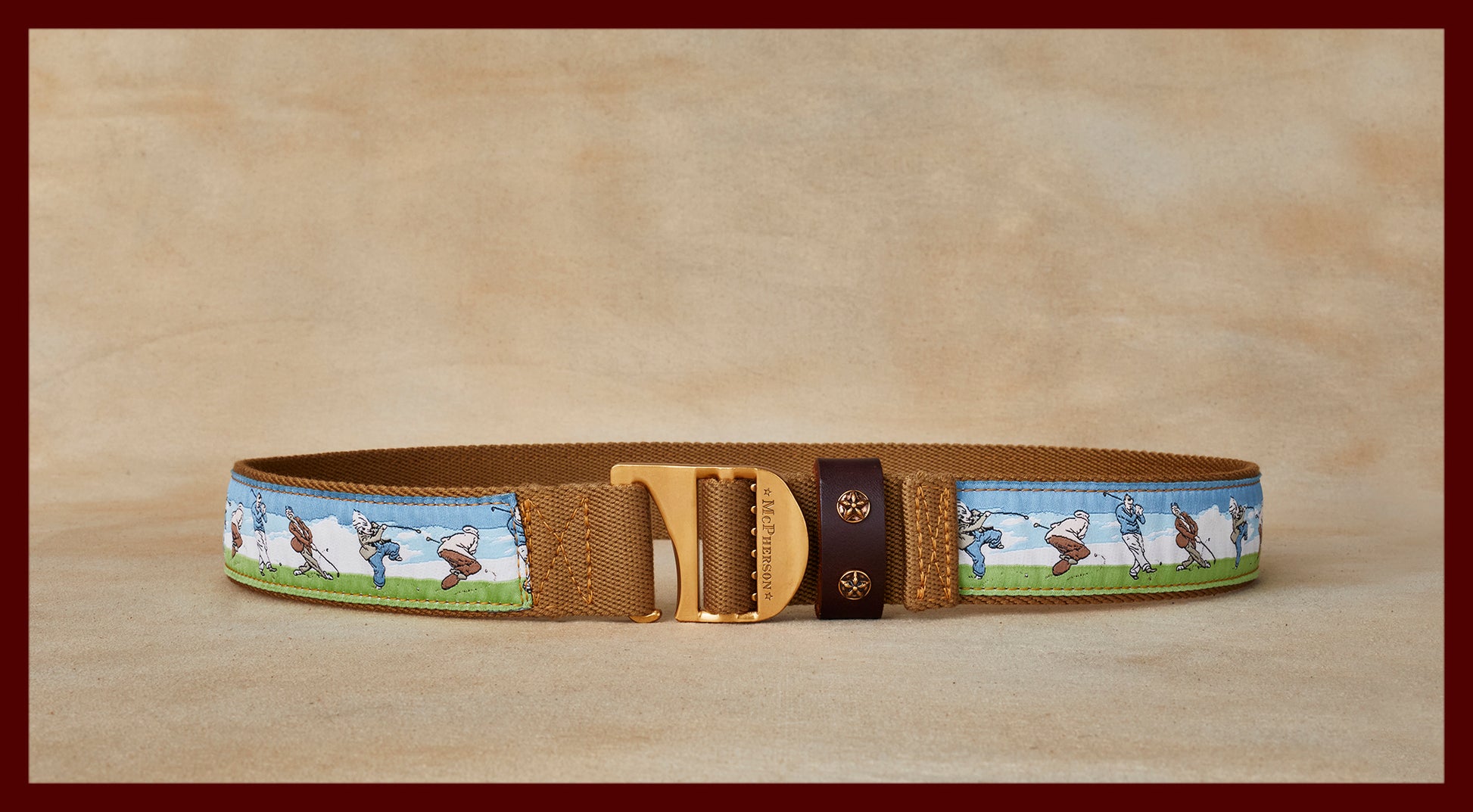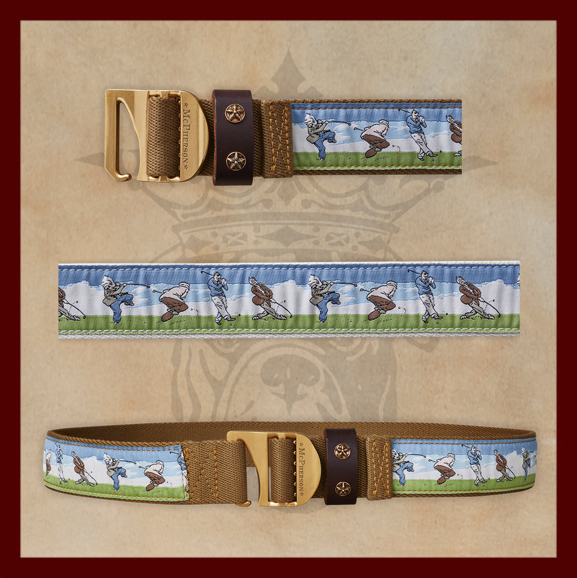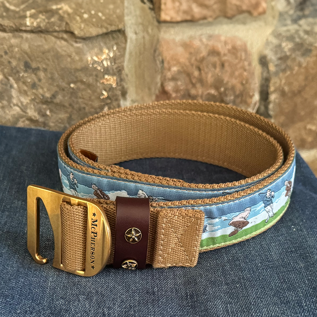 An artist designed exclusive pattern woven by master craftsmen stitched to our custom durable polyester web belt fitted with our solid brass tank buckle. Fit to your liking once and never bother again. Made by hand in the USA.
