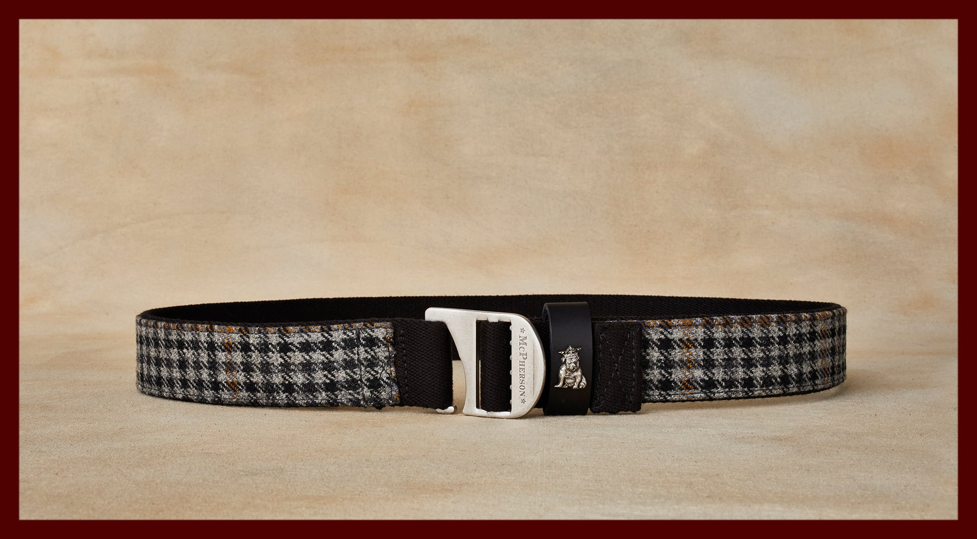 100% wool tweed plaid woven in the Scottish countryside by master artisans stitched to our custom durable polyester web belt fitted with our solid brass tank buckle. Fit to your liking once and never bother again. Made by hand in the USA.