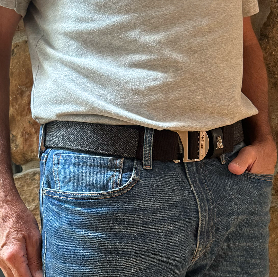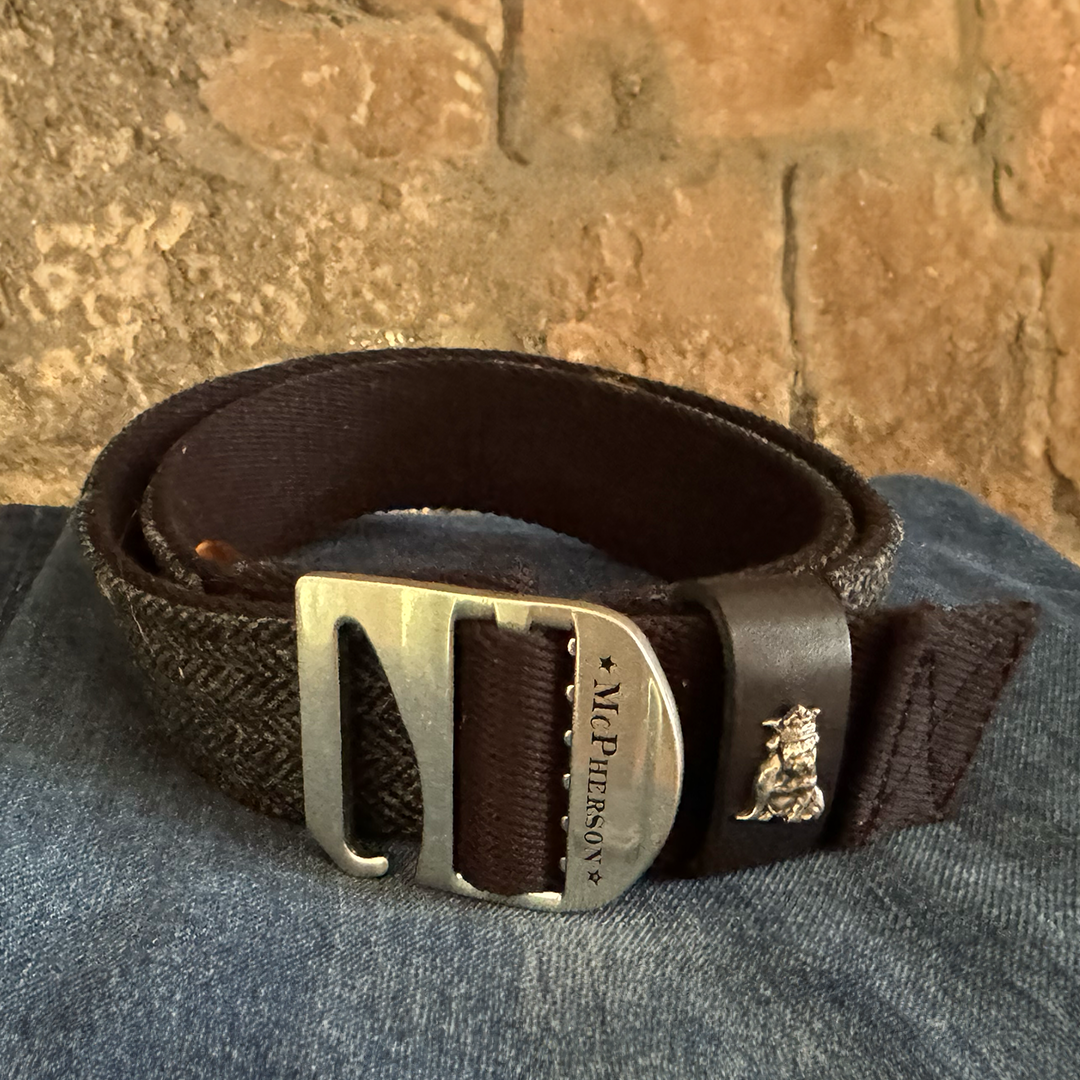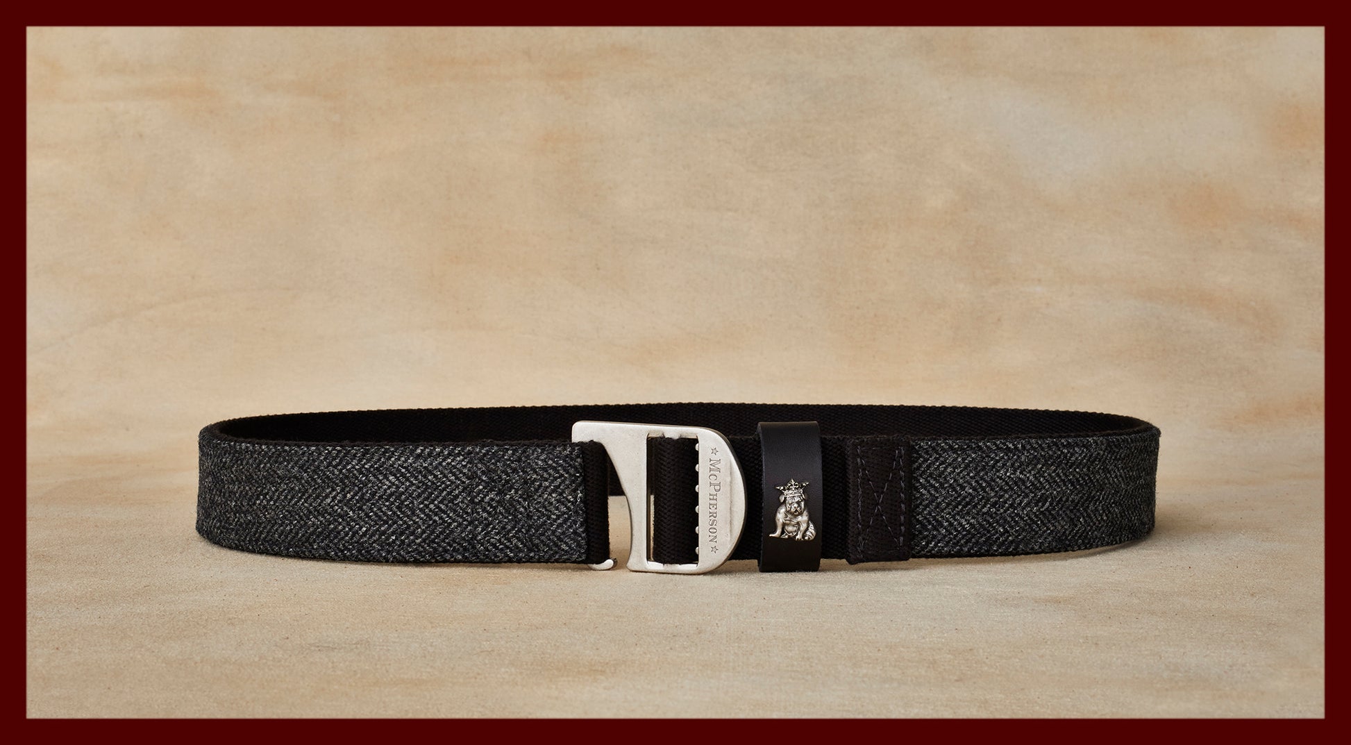 100% wool tweed woven in the Scottish countryside by master artisans stitched to our custom durable polyester web belt fitted with our solid brass tank buckle. Fit to your liking once and never bother again. Made by hand in the USA.