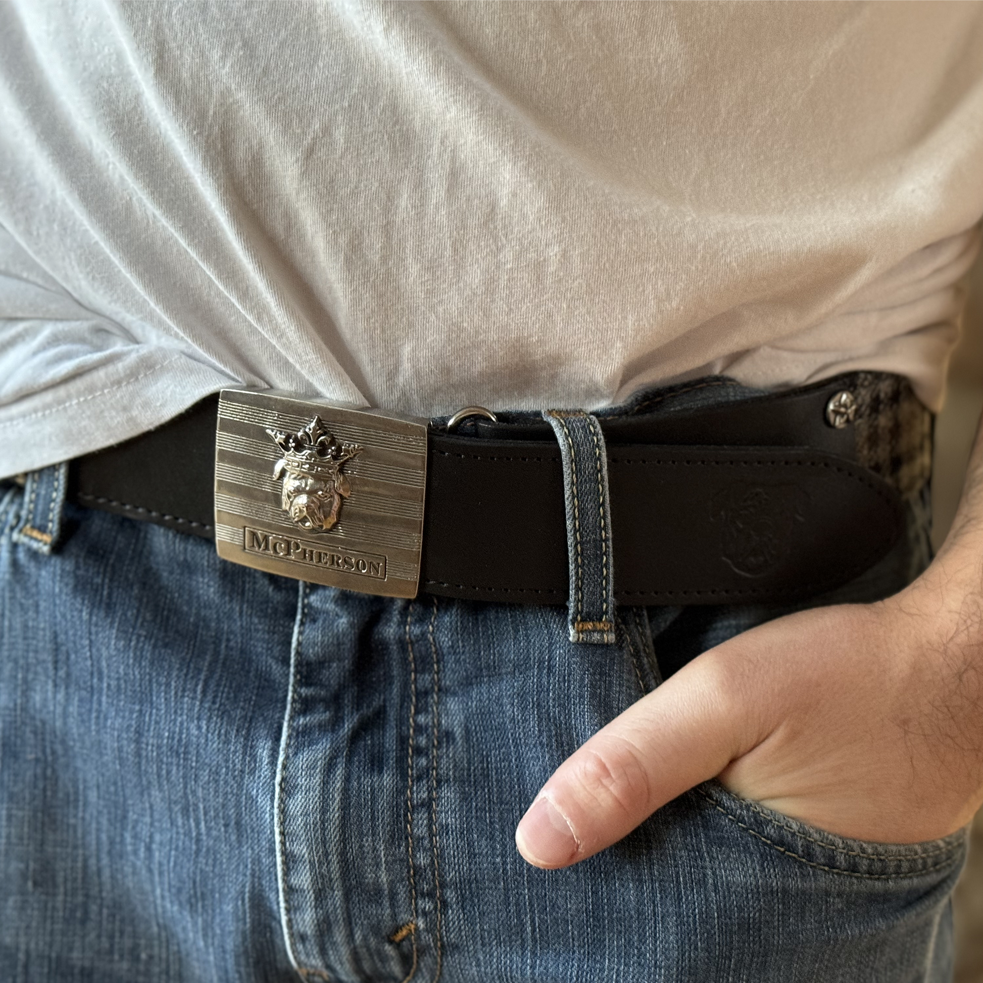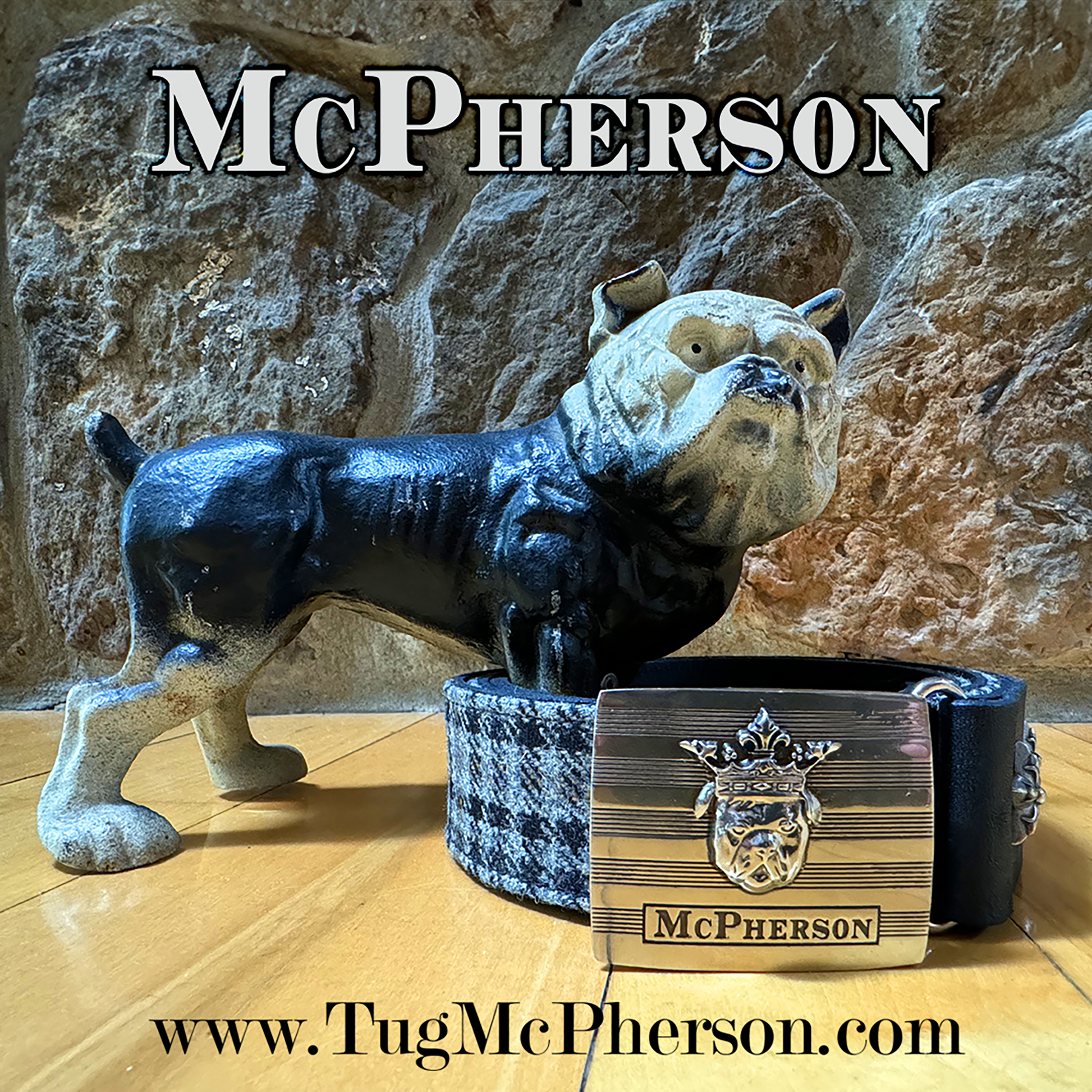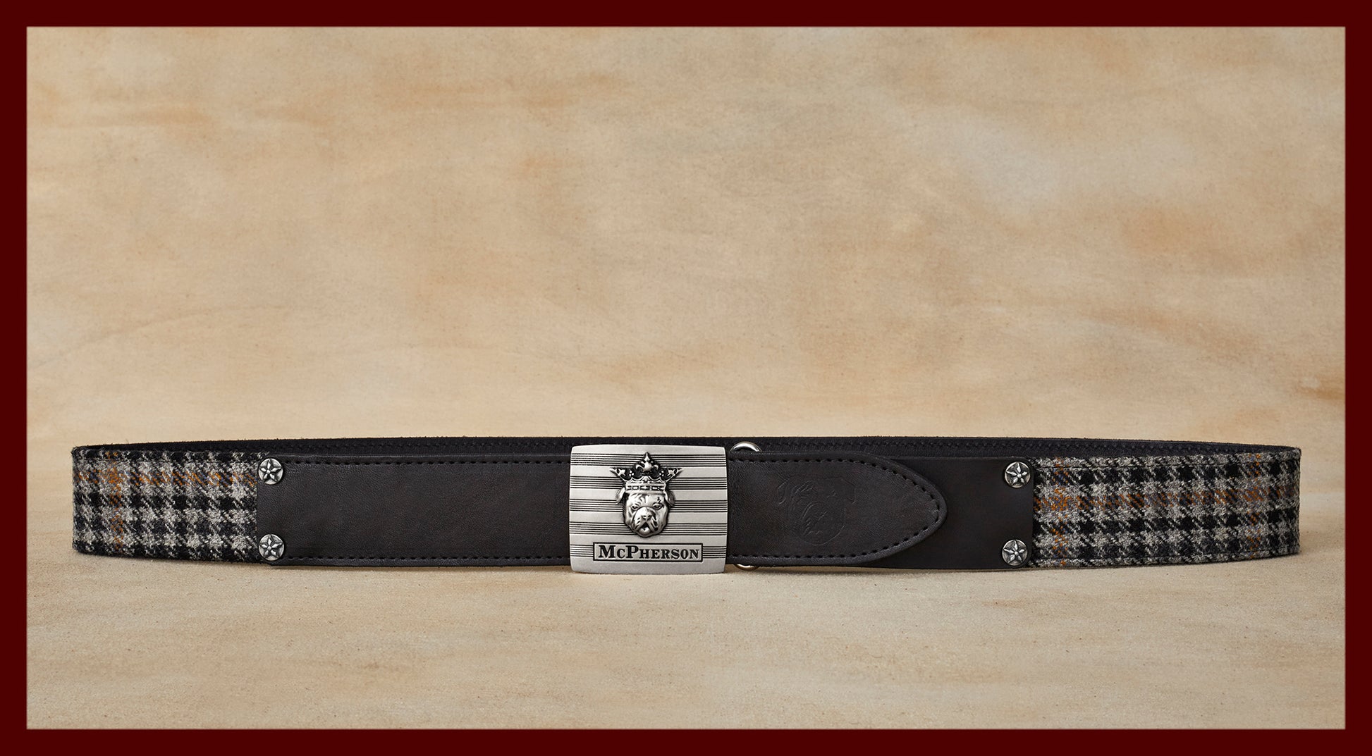 Scottish wool plaid tweed combined with Italian vegetable tanned cowhide fitted with an antique inspired engine turned slider style Tug McPherson buckle. Variations in leather color and texture are natural ensuring each belt is unique. Made by hand in the USA.
