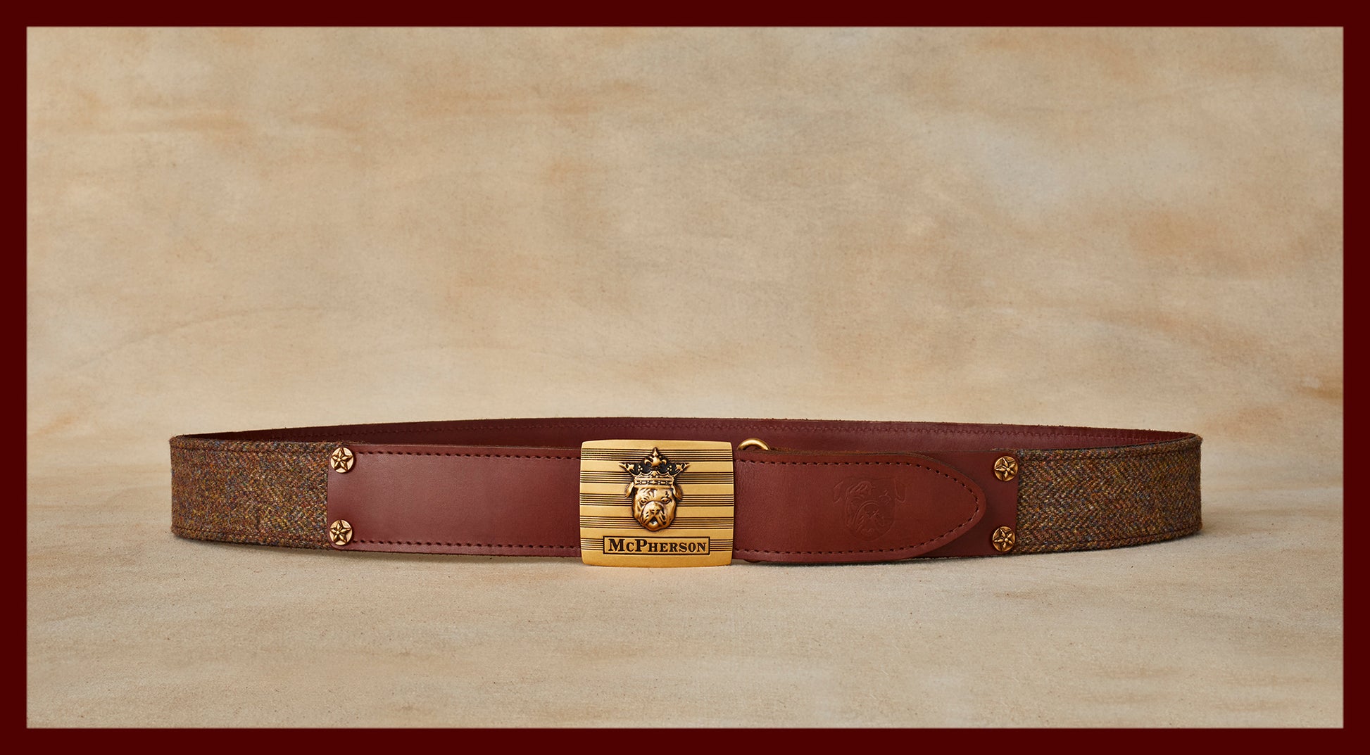 Scottish wool tweed combined with Italian vegetable tanned cowhide fitted with an antique inspired engine turned slider style Tug McPherson buckle. Variations in leather color and texture are natural ensuring each belt is unique. Made by hand in the USA.