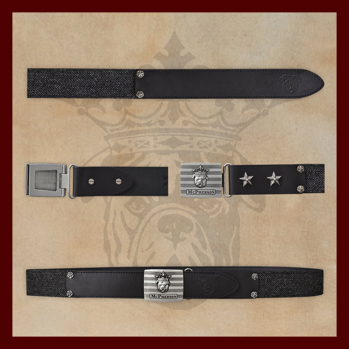 • 1 5/8” wide combination of top grain Italian vegetable tanned leather and 100% Scottish wool styled without buckle holes to ensure a perfect fit